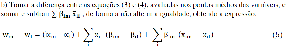 Onde 𝐰𝐰�𝐦𝐦−𝐰𝐰�𝐟𝐟 é a diferença do logaritmo dos salários médios. O último termo ∑𝛃𝛃𝐢𝐢𝐦𝐦(𝐱𝐱�𝐢𝐢𝐦𝐦−𝐱𝐱�𝐢𝐢𝐟𝐟) corresponde à parte da diferença de salários que se deve às diferenças de características ponderadas pelo valor que se dá a essas características para o homem, ou seja, mede as diferenças de rendimentos devido às diferenças de atributos produtivos entre os trabalhadores. Essa parte do diferencial ocorreria se o mercado de trabalho fosse cego quanto ao gênero dos indivíduos.
