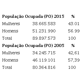 O mercado de trabalho no ocidente é predominantemente masculino, uma vez que eles eram considerados os provedores da família e, por outro lado, às mulheres cabia o papel de cuidar da casa, dos filhos e demais membros da família que são vulneráveis. Contudo, nos últimos anos a taxa de atividade feminina vem crescendo, o que reflete uma mudança no papel social da mulher e nas relações de gênero. No Brasil, de acordo a Tabela 1, a taxa de atividade feminina passou de 42,63% para 43,01%, de 2005 para 2015, respectivamente. A desigualdade de taxas de atividade por gênero ainda persistia em 2015, com uma diferença deaproximadamente 14 p.p. Apesar de que a grande maioria das mulheres ainda enfrenta uma dupla jornada de trabalho, além do trabalho remunerado, as mulheres dedicam mais horas do que os homens às atividadesdomésticas, as quais incluem cuidar dosdemais vulneráveis do núcleo familiar como crianças e idosos (CHEVALIER,2007 FERNANDEZ, 2009; POGGIO, 2010; HIROMI, 2016). Entretanto de forma lenta surgem outros arranjos familiares os quais liberam mais tempo para as mulheres reduzirem o tempo gasto nas atividades domésticas e dedicarem mais tempo para a vida profissional. No geral, ainda predomina na sociedade brasileira a dupla jornada.