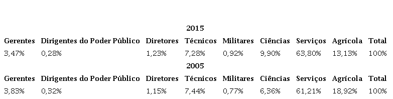 Na Tabela 2 é possível verificar a distribuição da população ocupada por ocupações selecionadas. Observa-se que a grande maioria da população brasileira estava trabalhando nos Serviços com61,21% em 2005 e aumentou para 63,80% em 2015; a segunda ocupação com maior percentual é a atividade Agrícola e teve importante redução de 18,92% e 13,13% para o período de 2005 e 2015, respectivamente, refletindo a redução dos postos de trabalhos nesse setor que foi liderado pelo intenso uso de tecnologia poupadora de mão de obra.
