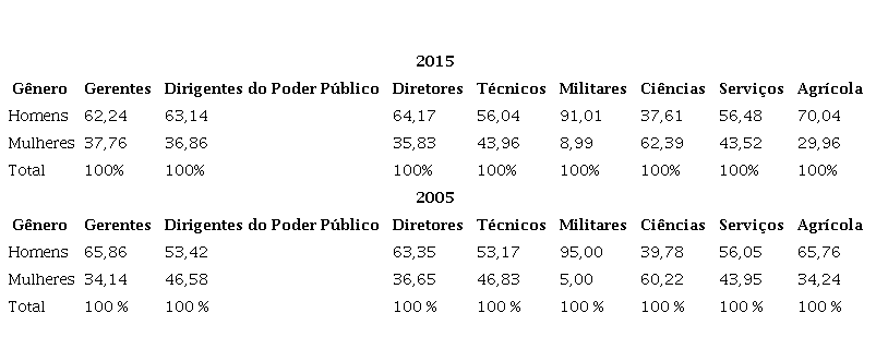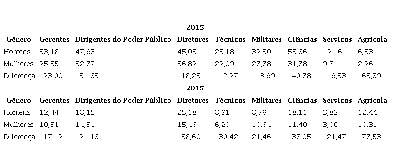 A ocupação Militares é tipicamente masculina e apresenta um percentual muito elevado 91,01% de homens em 2015. Já, nas ocupações dos Serviços e Técnicos, as taxas de atividade masculinas e femininas são próximas às taxas de atividade para cada gênero. Assim, os homens apresentaram taxas de atividades acima da média em ocupações de maior prestígio e remuneração que as mulheres, tais como, nas ocupações de Diretores, Dirigentes do Poder Público, Gerentes. Destaca-se a ocupação de Dirigentes do Poder Público que apresentou uma redução de aproximadamente 10% do total de mulheres ocupadas no período analisado. O período analisado foi de grande expansão da economia nacional, no entanto, as mulheres foram fracamente preteridas tanto no setor público como no privado nas ocupações nos níveis hierárquicos mais altos das empresas. Esses dados revelam fortes evidências de segregação vertical, isto é, existem barreiras de ascensão profissional para as mulheres terem progressão, as quais são denominadas de “teto de vidro” (glass ceiling), elas bloqueiam o acesso das mulheres à posição gerencial.