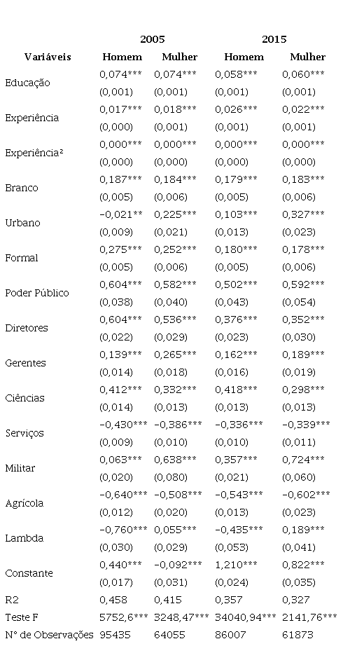 A Tabela 5 apresenta as estimativas das funções de salário para trabalhadores do gênero feminino e masculino em 2005 e 2015. Os resultados mostraram sinal positivo para a Educação e Experiência, portanto, quando ocorre aumento nessas variáveis, tanto para homens como para mulheres, os salários aumentam. Esses resultados condizem com os postulados da teoria do capital humano.