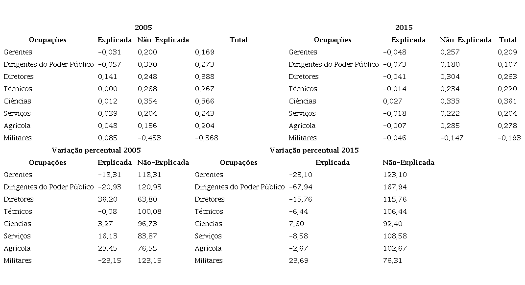 Destaca-se o comportamento da ocupação de Militares, em 2005 tinha o maior percentual (123,15%) do componente associado à discriminação (Não-Explicado) e apresentou grande redução em 2015 (76,31%). Nesse caso, a diferença salarial é favorável às mulheres. Em 2005, em média, as mulheres na ocupação de militares recebiam aproximadamente 2% a mais que os homens na mesma ocupação. Já, em 2015, elas recebiam em média 4% a menos que os homens na ocupação de militares. Contudo, quando adicionado às demais variáveis de controle, as mulheres apresentaram vantagem salarial nesta ocupação para 2015. O contingente militar das forças armadas de mulheres no Brasil expandiu-se fortemente a partir de 2004, apesar do pequeno percentual, cerca de 7%, entretanto, essas militares são majoritariamente graduadas e oficiais subalternos, cujos salários são superiores aos dos praças. O serviço militar para os homens é obrigatório, o que contribui para grande contingente masculino de baixa patente. De acordo com Resende (2017), a participação nas patentes superiores é pouquíssima expressiva mantendo-se constante desde 2004, mas, potencialmente, pode aumentar ao longo do tempo.