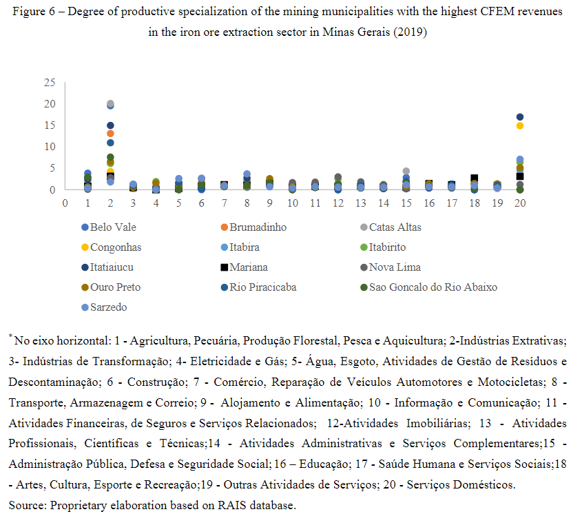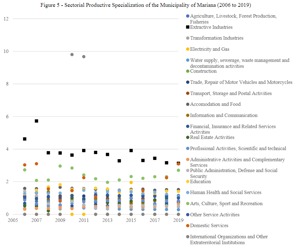 For the calculation of the sectorial LQ of the municipality of Mariana, data from establishments provided by the RAIS, stratified by the National Classification of Economic Activities (CNAE – Classificação Nacional de Atividades Econômicas) version 2.0, were categorized by sections of Mariana and Brazil, in the period from 2006 to 2019. The results are available in Figure 5.