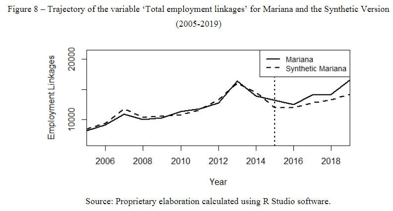 Figure 8 shows the total of employment linkages in Mariana compared to Synthetic Mariana during the period 2005 to 2019. The employment trajectory of Mariana resembles the Synthetic Mariana trajectory during the period prior to the dam break, strongly diverging from 2015. The period 2012-2014 stands out for its peak employability in Mariana, the hypothesis for this would be associated to the internal shock effect of Samarco's Fourth Pelletizing Project (P4P – Projeto de Quarta Pelotização)11 expansion works.