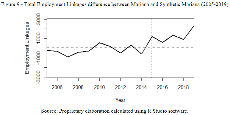 Figure 9 plots annual estimates of gaps in the trajectories of the variable total employment linkages for the treated unit and the synthetic control group. The valleys and peaks in the curve represent changes in the labor market between Mariana and her synthetic counterpart.