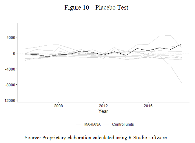 In order to analyses the significance of the estimation, Placebos Tests were performedAbadie, Diamond and Hainmueller (2010). Thus, interactions were performed for each of the 12 municipalities in the control group. In each interaction, data for dam disruption were simulated for all municipalities, that is, a synthetic unit was created for each of the analyzed municipalities, as these were also hypothetically affected by dam disruptions. Then, the estimated effect associated with each placebo was calculated. This interactive procedure provides a distribution of estimated gaps for municipalities where no intervention has taken place.
