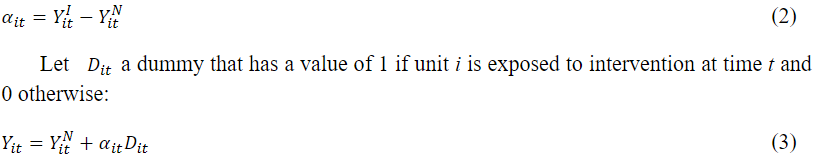 Assuming that the intervention has no effect on the result before the implementation period, therefore, for t ε {1, ..., T0} and all i ε {1, ..., N}, we have Y Iit= YNit . For Abadie et al. Abadie, Diamond and Hainmueller(2010), interventions may have an impact before their implementation, so, T0 is the first period in which the result may react to the intervention. This means that, for the authors, the results of the untreated units are not identified by the interventionimplemented in the treated unit.