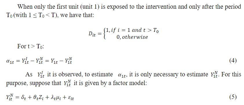 This model suppose the observation of the J + 1 units and only the first unit (region) is exposed to the intervention (treatment) of interest, so that the remaining that J units are potential controls (Abadie et al., 2010). Suppose also that the first unit is constantly exposed to the intervention of interest after some initial intervention period. So is be the result that would be observed for region i at time t in the absence of intervention, for the units i = 1, ..., J + 1, and time periods t = 1, ..., T. Let T0 the number of pre intervention periods, with 1 T0 T.