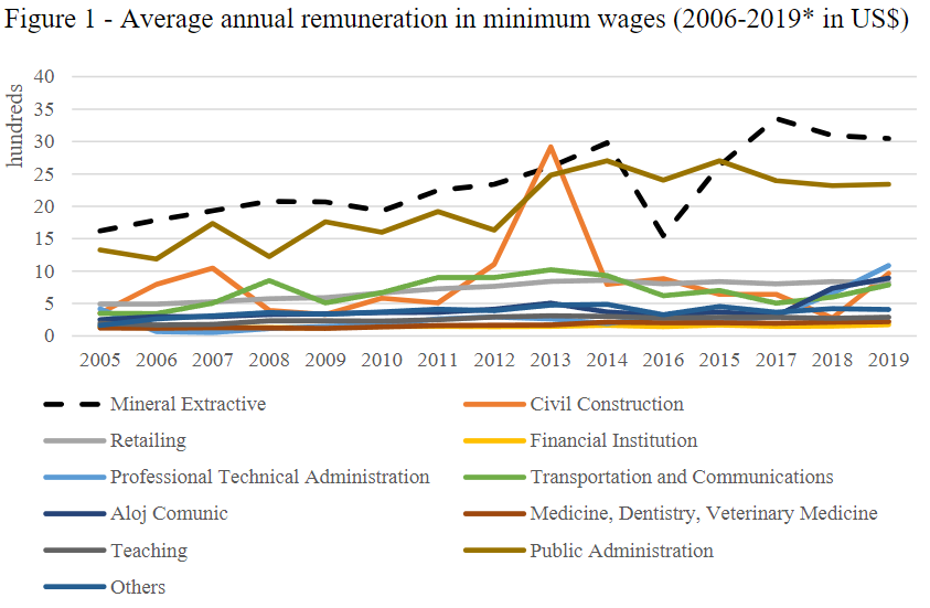 In the context post-rupture of Fundão dam's, after 2016, the Figure 01 shows an increase in the average remuneration for the mining extractivist sector, which may be related to the maintenance of the salaries of Samarco employees and outsourced companies, transferred to a layoff regime (temporary suspension of employment contract with maintenance of compensatory payment) and agreements Voluntary Dismissal Programs (PDV – Programas de Demissão Voluntária) signed between the company and the workers (SAMARCO, 2017). Aditionally, considering the data from the Annual Report on Social Information (RAIS – Relação Anual de Informações Sociais), the mineral extractive sector has the highest average remuneration of the municipality following by the construction,which is largely dependent on mining activity, decreasing from 2013.