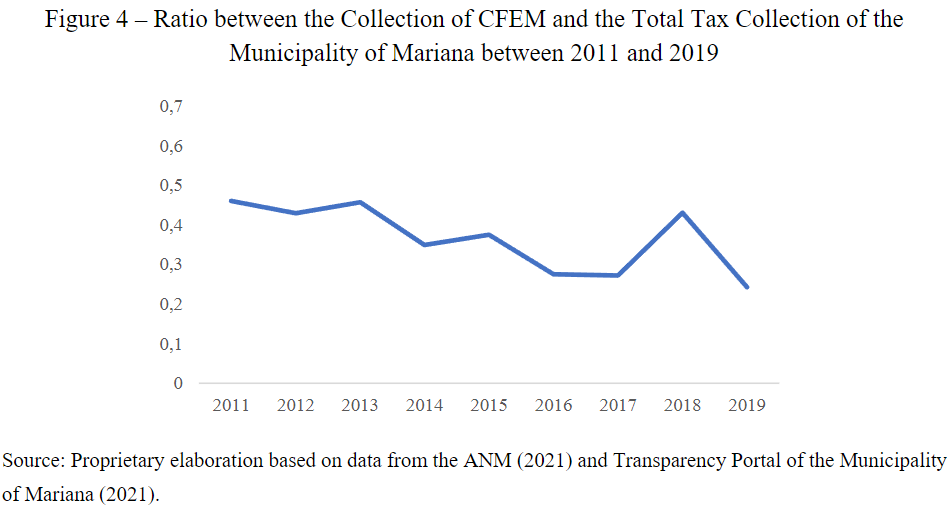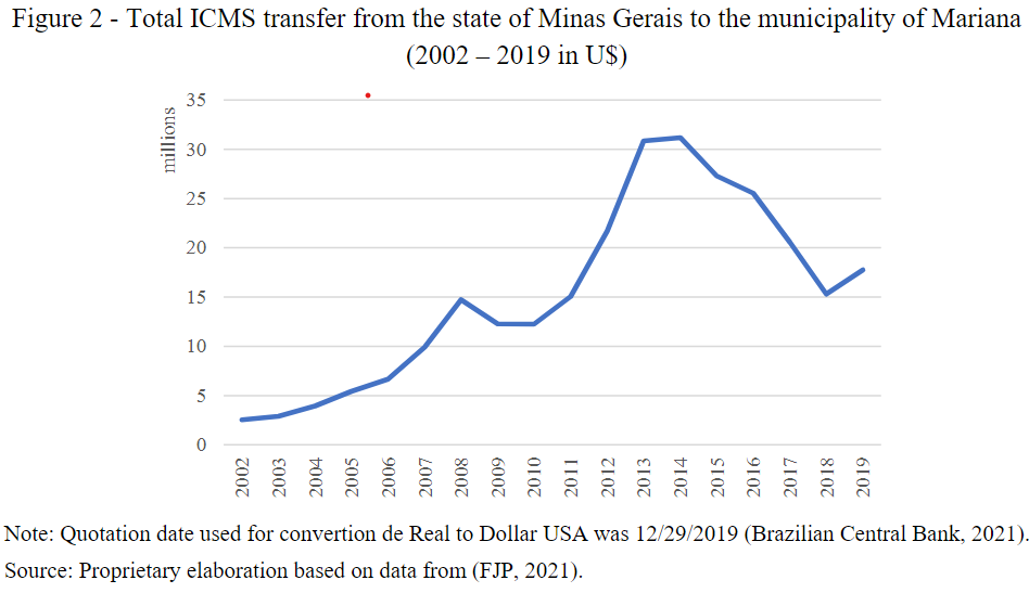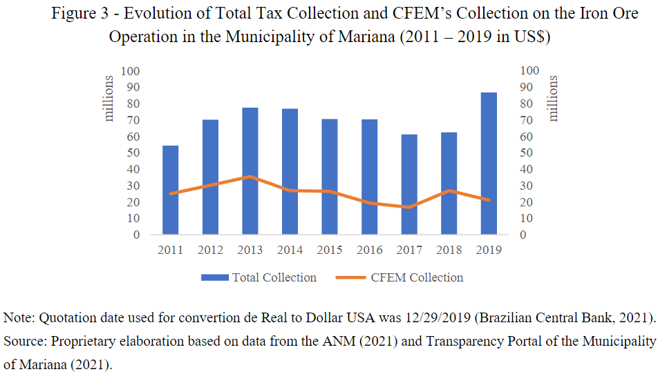 In the last decade, Mariana became one of the Brazilian municipalities that increased its tax collection revenue through the CFEM (ANM, 2019). According to Silva, Silva e Andrade (2017) the increased financial capacity of this municipality, boosted by mining would enable the local public government to increase its margin of action regarding public investments and expenditures in order to improve the socioeconomic conditions of its population. However, according to the study, the city after the disaster of the Dam of Fundão remains with problems regarding the distribution of income, land concentration and real estate speculation; others problems related to the quality of education of its population, and difficulties in establishing consistent plans for urban expansion and infrastructure.