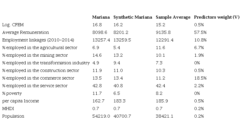 Still, by the Table 4 it is possible to verify that the predictors offer a good fit. The values of the averages in Mariana and Synthetic Mariana are close, except for the predictors percentage of employees in the transformation industry, poverty and total population. As expected, the mining activity variables presented a good fit, reinforcing that this characteristic is determinant for the sample choice. This suggests that the high value of the MSPE may be related to the lack of a longer observation period after the shock, and not to the inefficiency of the municipalities selected to form the synthetic unit.