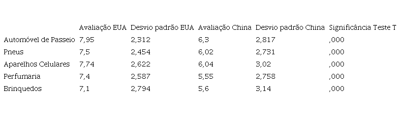 A primeira análise buscou verificar a existência dos estereótipos de cada país. Para tanto, foram analisados apenas os casos em que os entrevistados não tinham conhecimento de nenhum dos produtos de ambos os países e se comparou as médias da avaliação de cada produto.