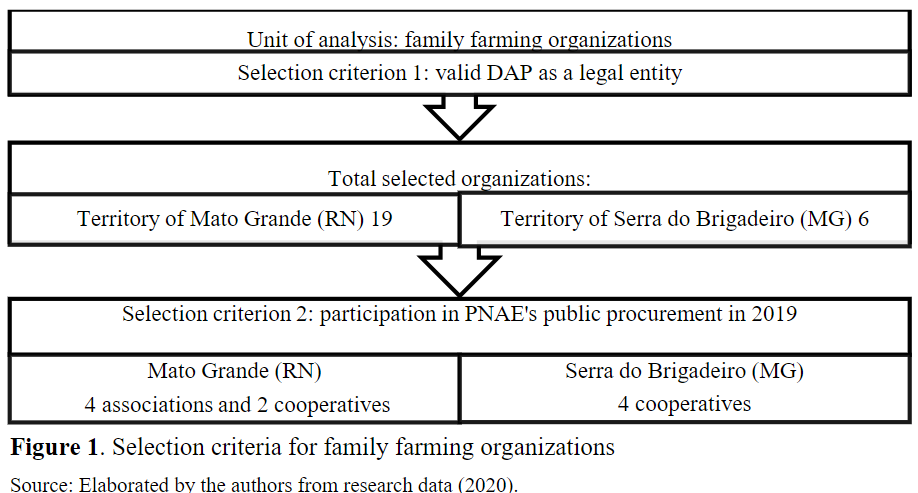This descriptive and qualitative research adopted the method of multiple-case study. According to Yin (2001), each case in a multiple-case study has a specific purpose within the global scope of the research. This study uses a comparative perspective to analyze two blocks of cases, represented by organizations located in rural territories of two Brazilian states (Rio Grande do Norte – RN and Minas Gerais –MG). Figure 1 shows the organizations’ selection criteria in the two territories, Mato Grande (RN) and Serra do Brigadeiro (MG).5 It is worth noting that the base criterion was the organization’s status in the Brazilian National Program to Strengthen Family Farming (PRONAF). The organization had to have a valid declaration of aptitude to operate within Pronaf (DAP) as a legal entity,6 which was verified by searching the website of the Special Secretariat for Family Farming and Agrarian Development (SEAD, 2019).