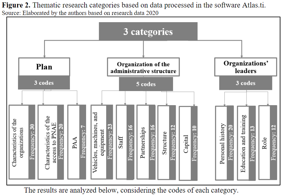 Escobal et al. (2015) highlight the importance of recognizing that public policies and programs implemented in a territory find a series of structures and processes already in place that can strengthen or weaken their effects. This research showed that the existence of family farmer organizations in the territories and their previous experience with the PAA facilitated the implementation of PNAE, which, in turn, contributed to strengthening the structure of these associations and cooperatives. The analysis of the categoryplan, represented by the code characteristics of the organizations in the territories, contributes to identifying particularities regarding the administrative structure and the organizations’ leaders.