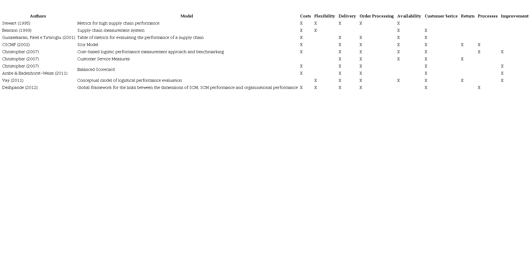 In this context, it was searched in the literature, the performance evaluation models of the supply chain (Chart 1) with the indication of the used variables. It is worth noting that proposals for new models were not found in the last ten years, but applications of existing models.