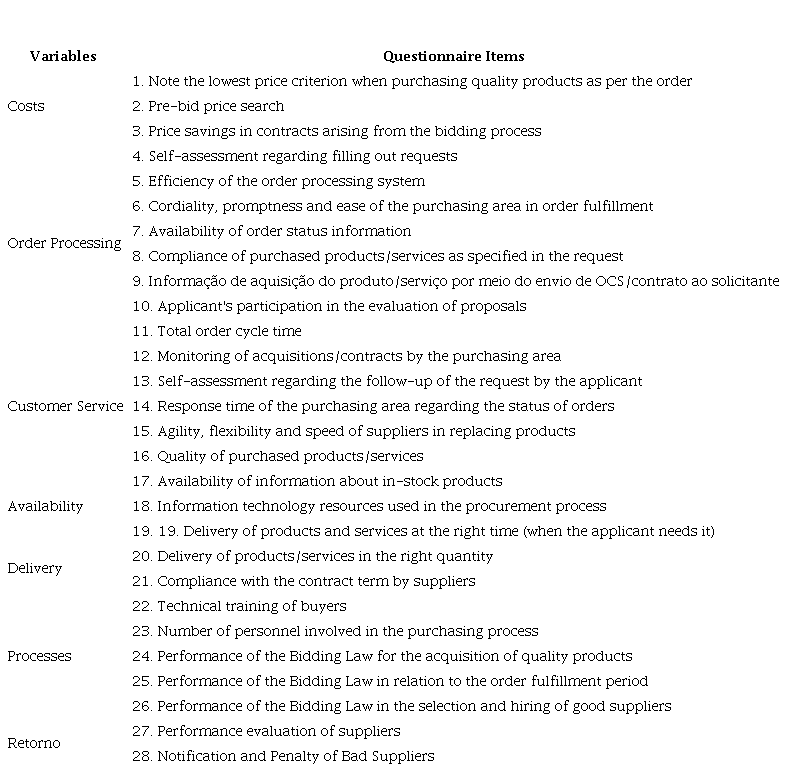 For this research, the nine variables identified in Table 1, seven variables (cost, order processing, customer service, availability, delivery, processes, and return) were analyzed through a questionnaire detailed in Chart 2. A proposal for the variable "improvement" and the variable flexibility was not analyzed in this study. Due to the obligation to follow the rite of legislation, the public sphere makes the evaluation of this variable unfeasible.