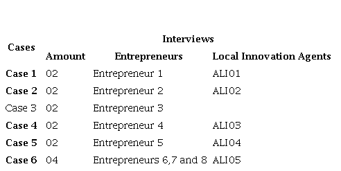 We applied a semistructured interview as source of evidence that provides the researcher with a list of topics and issues to be addressed, modified during the interview depending on the context, thus allowing further conclusions (SAUNDERS; LEWIS; THORNHILL, 2009). We conducted nine interviews with an average duration of one hour and a half with entrepreneurs who represent successful cases in the LIA Program for implementinginnovation actions in their companies, in addition to five Local Innovation Agents who worked with the selected companies. Each interview was recorded using an audio recorder, transcribed, and further analyzed when describing each case. Chart 1 shows therespondentsand corresponding company.