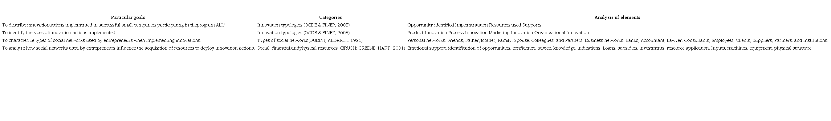 Specifically, our goal is to describe the actions and types of innovation adopted by the entrepreneurs in study, as well as to characterize the types of social networks used and accessed resources. In the theory scope, we seek to contribute with theanalysis of how entrepreneurs’ social networks favor innovation actions in small companies and by highlighting the role of these networks in the access to the resources required for innovation deployment. In a practical context, this study intends tocontribute to different supporting bodies tosmall companies in the encouragement ofactions that promote the development and expansion of these social networks in the scope of small companies.