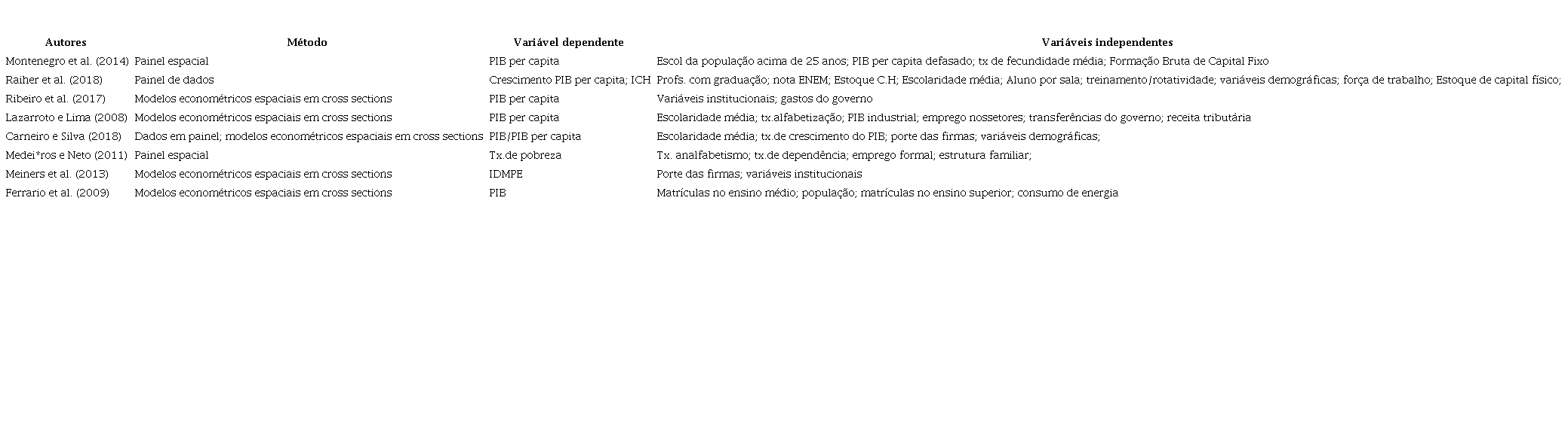 De forma geral, o que se pode verificar nas teorias, tanto de localização como de crescimento regional, é que existe um conjunto de fatores tanto econômicos (investimentos, lucros, juros, mercado externo, renda, participação dos setores), como sociais (demografia, cultura, educação) e regionais (governo, instituições, histórico e condições geográficas), que afetam o modo como ele ocorre, possibilitando uma grande quantidade de variáveis que são utilizadas para estudá-lo em determinada região. Indo ao encontro dessa multiplicidade de fatores, na Tabela 1 é apresentado um resumo dos trabalhos empíricos que, partindo de um referencial tanto teórico como metodológico, analisam o crescimento econômico regional.