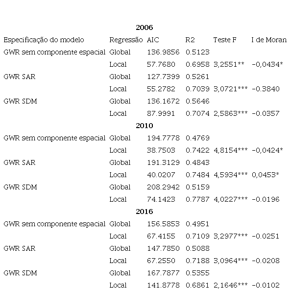 Para se começar a análise do modelo GWR, como visto na metodologia, o primeiro passo é avaliar se o mesmo apresenta melhor ajuste do que o modelo global. Para isso, na Tabela 2 é apresentado os resultados para estimação do GWR com e sem a dependência espacial das variáveis dependente e independentes, comparando com as estimações em nível global entre todos os anos. Para se avaliar o melhorajuste, Almeida (2012) indica verificar o menor critério de informação de Akaike (AIC), maior coeficiente de determinação e a não dependência espacial no resíduo, obtido pelo I de Moran (ALMEIDA, 2012).