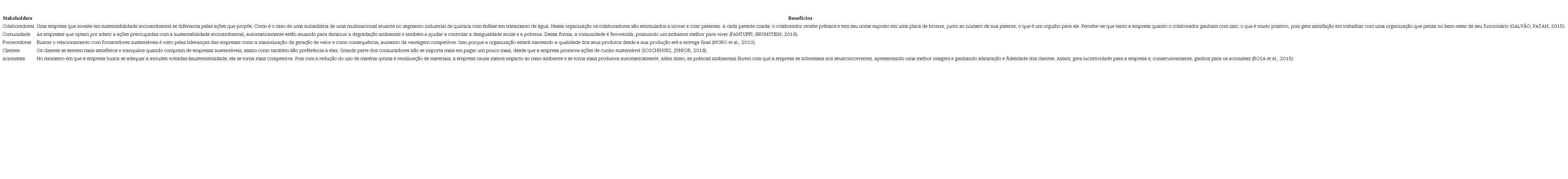 No momento em que uma empresa possui essa capacidade de investir em ações voltadas à sustentabilidade socioambiental, ainda existe o desafio de fazer com que todos dentro da empresa entendam a importância de fazer parte dessa ideia (FROEHLICH, 2014).O Quadro 1 apresenta os benefícios da sustentabilidade socioambiental para cada stakeholder.