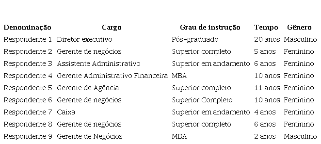 Para identificar se os colaboradores da agência conhecem o que a cooperativa pratica de sustentabilidade socioambiental, tanto em forma de planejamento, como também de ações, elaborou-se um questionário que também foi aplicado para um membro da diretoria administrativa da cooperativa. O Quadro 2 apresenta o perfil dos respondentes.