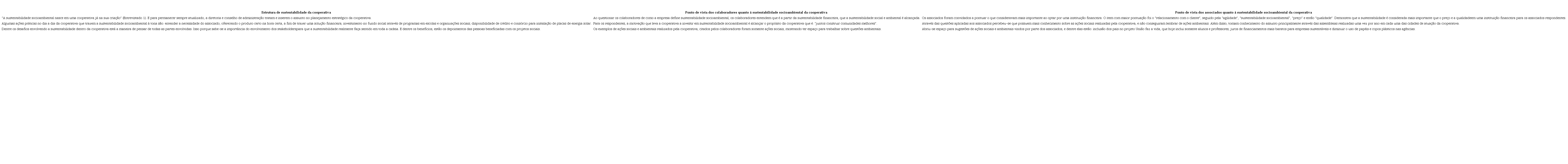 As respostas obtidas por meio da entrevista e do questionário aplicado aos colaboradores, associados e integrante da diretoria permitiu que as pesquisadoras pudessem comentar a relação entre o que dizem em comparação com o relatório de sustentabilidade socioambiental da cooperativa e o referencial teórico de sustentabilidade socioambiental, contemplando a análise qualitativa.