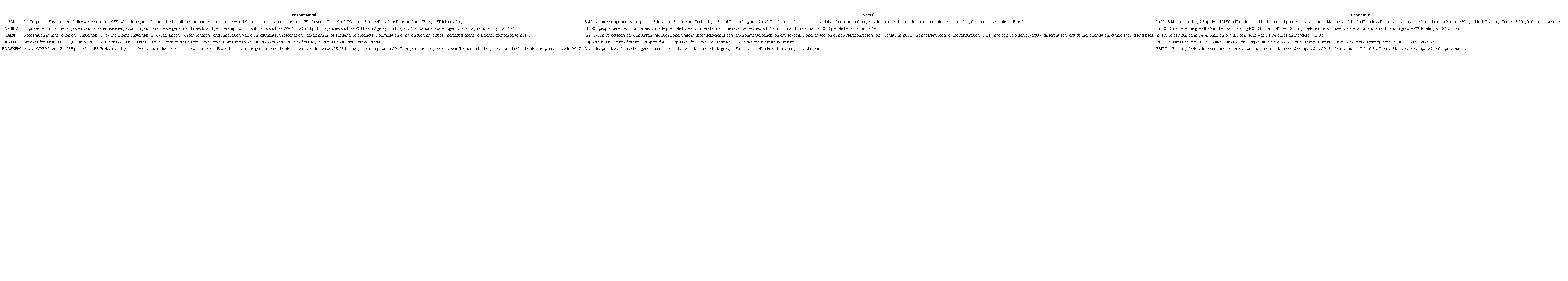 Through the data collected from the five companies chosen (3M, AMBEV, BASF, BAYER and BRASKEM), it was possible to see more specifically how each of them puts into practice sustainability within their work environment. The data were found in the most recent Sustainability Reports available on their respective websites. The following are the highlights in the three dimensions of the Triple Bottom Line.