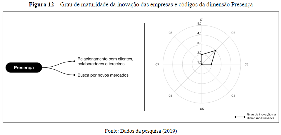 A partir da análise de fatores como a criação de novos canais e pontos de vendas e a utilização de distribuidores/representantes para vendas externas, observou-se que apenas algumas empresas inovaram nessa dimensão, adotando apenas melhorias relacionadas aos canais de venda e comunicação. A apresentação e venda dos produtos ocorrem principalmente nas sedes das cerâmicas, através de visitas presenciais dos clientes, telefonemas e e-mails. Porém, algumas empresas já passaram a utilizar sites, redes sociais e aplicativos de mensagens para facilitar o acesso àqueles clientes que moram em outras regiões e também, agilizar a realização dos pedidos. Exceto em uma única empresa, todas as demais não possuem representantes comerciais como meio de vendas externas devido aos custos elevados em manter um representante, incapacidade operacional em atender uma elevada demanda em relação à atual e aumento do risco de inadimplência com clientes desconhecidos. Na Figura 12 estão contidos os códigos e a pontuação obtida pelas empresas na dimensão Presença.