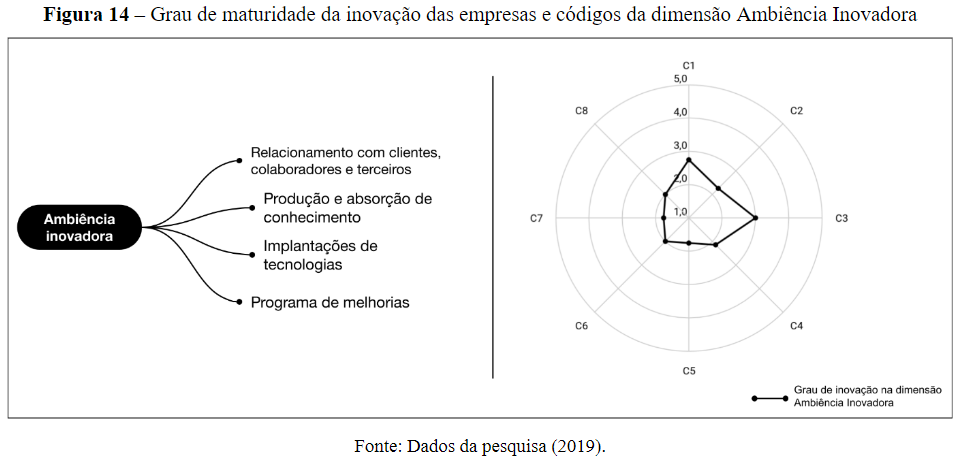 As empresas buscam frequentemente, em entidades públicas e privadas, apoio para a qualificação e treinamento de funcionários, além da realização de consultorias sobre gestão dos recursos organizacionais. Apenas metade das empresas buscaram e absorveram conhecimentos ou tecnologias com fornecedores, clientes ou em eventos do setor, sendo voltadas para o aperfeiçoamento de máquinas, processos e produtos. No que diz respeito à abertura para participação dos funcionários com sugestões de ideias, nenhuma das empresas tinha um sistema formal de coleta de opinião, porém, três delas consideram a implantação de tal sistema no futuro. Na Figura 14 estão contidos os códigos e a pontuação obtida pelas empresas na dimensão Ambiência Inovadora.