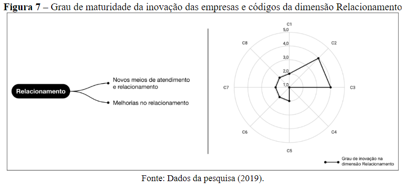 Em relação à utilização de facilidades e recursos para melhorar o contato com os clientes e a implementação de recursos de informática para facilitar a exposição e comunicação com os atuais e novos compradores, observa-se que a maioria das empresas não inova quanto a esses aspectos, não havendo transformações radicais na maneira como as empresas se relacionam com os clientes. Cinco empresas utilizaram de brindes, cartões de visita, suvenires etc. como uma estratégia para agradar aos clientes e assim mantê-los fiéis à empresa, como também para estimulá-losa divulgarem a empresa através do marketing boca a boca. Todas as empresas utilizam prioritariamente o telefone fixo e o e-mail como meio de comunicação, porém metade das empresas introduziram as redes sociais e aplicativos de mensagens instantâneas para agilizar a comunicação e assim tornar mais ágeis as solicitações de pedidos e feedbacks. De acordo com Araújo (2013), as utilizações de novas ferramentas de comunicação vêm sendo amplamente utilizadas em empresas de pequeno e médio porte que buscam melhorar o relacionamento com seus clientes, mas também com outros stakeholders. Na figura 7 estão contidos os códigos e a pontuação das empresas na dimensão Relacionamento.
