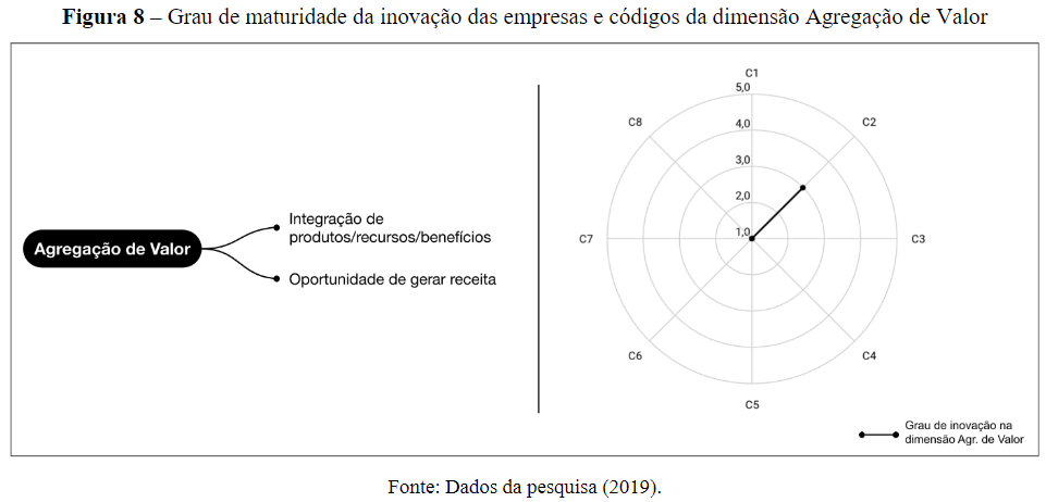 Na avaliação de aspectos relacionados à agregação de valor, como a geração de receita a partir de recursos existentes e entrega de valor por meio de novas soluções, verifica-se que não há preocupação das empresas em inovar nessa área. Numa perspectiva voltada à indústria, o valor é entendido como a importância monetária do conjunto de benefícios (técnicos, econômicos, de serviços etc.) que a empresa entrega mediante o recebimento de pagamento pela oferta (ANDERSON; NARUS, 1999). Porém, no caso da indústria cerâmica, como se trata de produtos intermediários de baixa complexidade tecnológica, as possibilidades de agregação de valor são limitadas, restringindo-se a características, como design, durabilidade, resistência etc., que podem ser facilmente copiadas por outras empresas. A única cerâmica que inovou nessa área agregou valor aos seus produtos ao oferecer "pacotes de benefícios" e a integração com serviços técnicos. Na Figura 8 estão contidos os códigos e a pontuação das empresas na dimensão Agregação de Valor.
