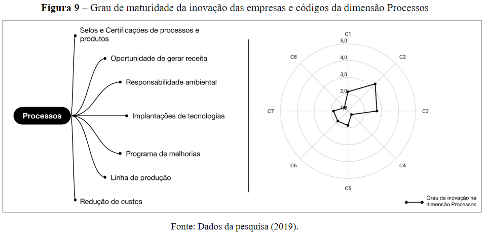 Para investigação dessa dimensão foram consideradas modificações nos processos, utilização de novas práticas de gestão, recursos e insumos. Os resultados demonstram a presença de poucas ou nenhuma inovação nessa área (GMI-3). A maioria das empresas buscam melhorar seus processos através da compra ou modificações nos equipamentos, gerando mais eficiência e rapidez em todas as etapas de fabricação. Com uma preocupação ambiental e econômica, algumas empresas adotaram mudanças nos vetores energéticos e pretendem implantar equipamentos para o reaproveitamento dosrejeitos de fabricação. A utilização de técnicas de reengenharia, gestão de qualidade total e manual de boas práticas são medidas presentes em apenas três cerâmicas. As que não utilizaram nenhumas dessas técnicas alegaram a necessidade de altos investimentos financeiros e intenso controle informacional, sendo um empecilho para a implementação. Na Figura 9 estão contidos os códigos e a pontuação obtida pelas empresas na dimensão Processos.
