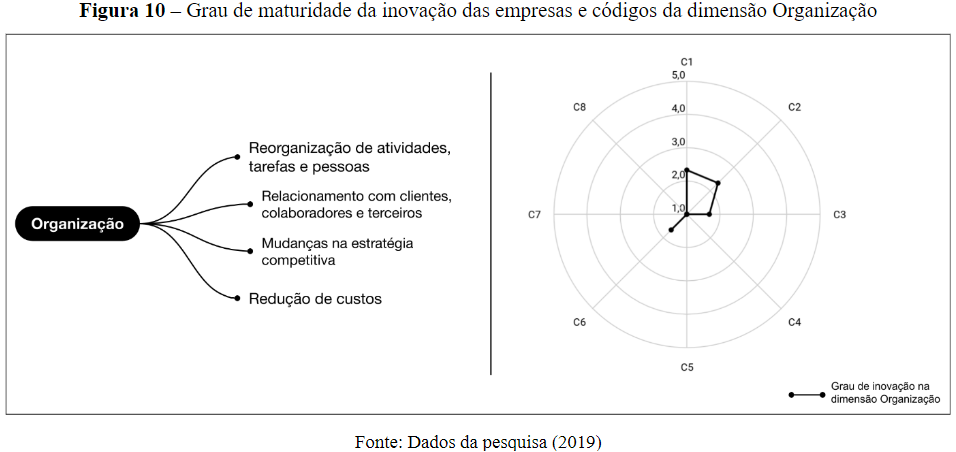 Inovações relacionadas a essa dimensão, segundo Tigre (2006), consistem em implementar novos métodos organizacionais dentro da "rotina operacional de uma empresa, na organização do trabalho ou em suas relações externas". Assim, por meio da investigação de mudanças na estratégia competitiva, criação de parcerias com terceiros e reorganização das atividades internas, foi observada a presença de poucas inovações nessa dimensão. Nenhuma empresa realizou mudanças na estratégia competitiva, porém tentaram estabelecer novos diferenciais a partir de parcerias com terceiros para capacitação de funcionários, consultoria técnica e pesquisa de mercado. Algumas empresas realizaram mudanças na alocação de funcionários e tarefas para melhorar a eficiência organizacional. Na Figura 10 estão contidos os códigos e a pontuação obtida pelas empresas na dimensão Organização.