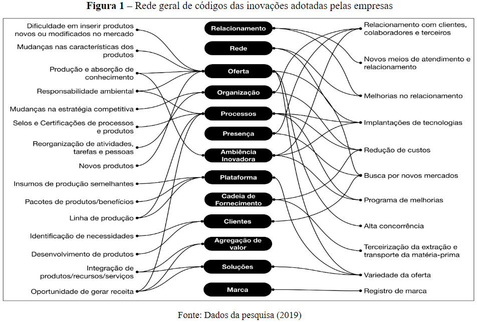 As informações fornecidas foram analisadas por meio do ATLAS.ti v.8, que possibilitou atribuir códigos que indicam os direcionamentos às inovações adotadas. Cada dimensão contém um conjunto de códigos próprios, porém, um mesmo código pode estar presente em outra dimensão, ou seja, quando o código redução de custosocorre nas dimensões Processos, Organização e Cadeia de Fornecimento isso significa que as ações inovadoras realizadas tiveram como foco minimizar custos envolvidos no processo produtivo e na estrutura organizacional. Na Figura 1 é possível visualizar a rede geral de códigos contendo as dimensões, seus respectivos códigos e suas múltiplas ligações com as dimensões.
