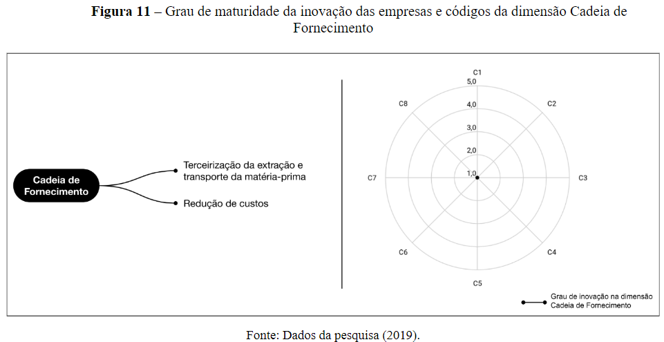 A cadeia de Fornecimento diz respeito à sequência de atividades relacionadas à movimentação de materiais da origem à entrega, abrangendo aspectos relacionados com a logística dos negócios. Nenhuma das empresas inovou nessa dimensão, sendo o (GMI=1). As cerâmicas demandam apenas dois recursos de terceiros, a lenha e a argila. São procurados fornecedores próximos à fábrica a fim de minimizar os custos envolvidos no transporte das jazidas até as fábricas. Além disso, são mantidos grandes estoques de argila e lenha, pois isso proporciona uma desejável melhora nas propriedades físico-químicas desses materiais, e também, garante uma proteção contra flutuação de preços. Na Figura 11 estão contidos os códigos e a pontuação obtida pelasempresas na dimensão Cadeia de Fornecimento.