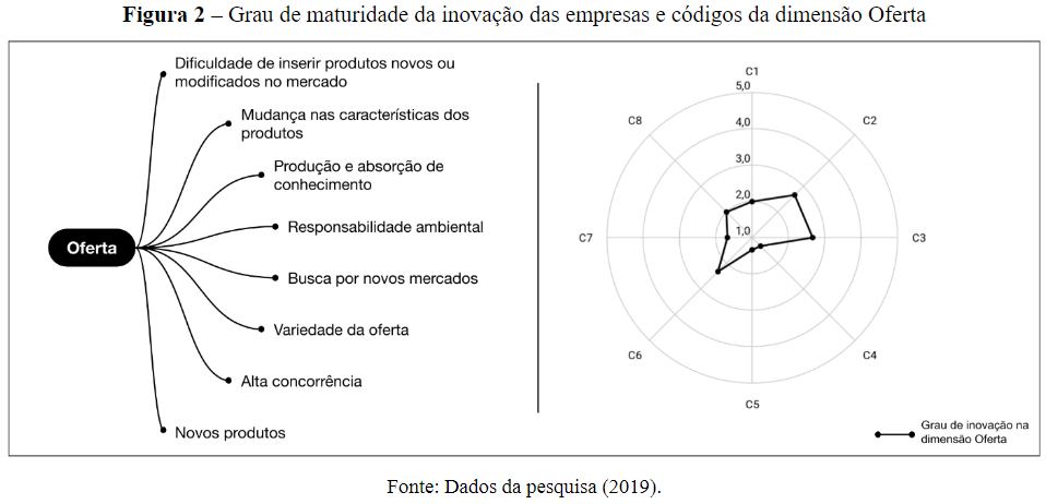Avaliadas quanto à busca por novos mercados, produção de novos produtos, mudanças no design, uso de novos materiais ou componentes e preocupação com o impacto do produto no meio ambiente, constatou-se que as empresas inovam pouco ou não inovaram nessa dimensão (GMI-3). A preocupação em expandir os mercados foi um comportamento identificado em seis empresas, que passaram a produzir novos produtos para atender a demanda de clientes em outros estados da região Nordeste. As empresas não atuam no desenvolvimento de novos produtos, com características e configurações totalmente novas, apenas utilizam modelos padronizados já registrados por órgãos reguladores. Metade das empresas adicionaram novos produtos em seu mix de produtos, fazendo isso por meio de conhecimentos e recursos tecnológicos contidos na própria empresa ou adquirido de terceiros. Cabe ressaltar que a oferta de novos produtos foi limitada por dois fatores: queda na atividade econômica do setor de construção civil e pouca abertura do próprio segmento para novos produtos, mesmo com desempenho superior. Na Figura 2 estão contidos os códigos e a pontuação obtida pelas empresas na dimensão oferta.