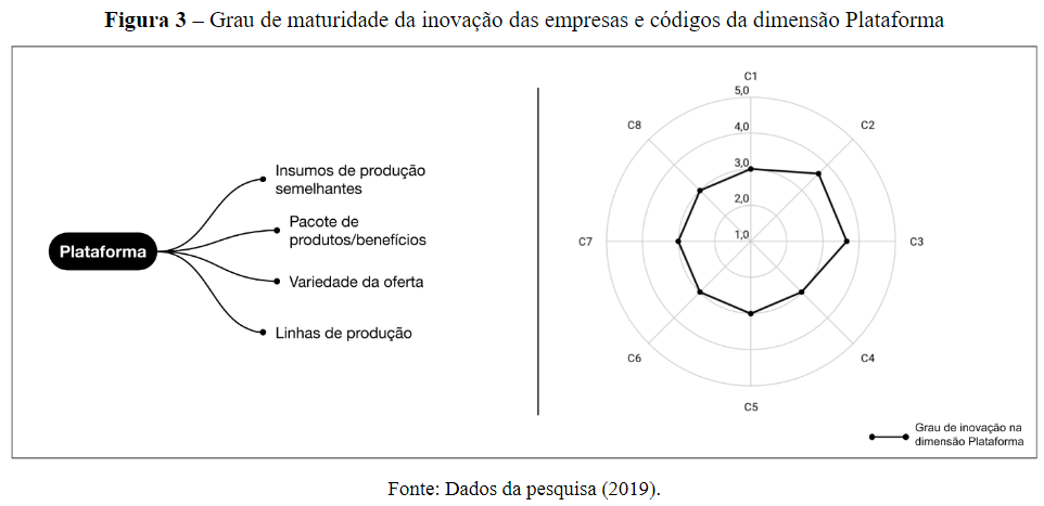 A análise dessa dimensão considerou os seguintes aspectos: utilização das linhas de produção, componentes utilizados nos produtos e variação dos produtos fabricados. Os resultados demonstraram que as empresas inovaram ocasionalmente nessa dimensão (GMI≥3). Existe uma preferência das empresas por linhas únicas de produção que sejam adaptadas para a fabricação de mais de uma família de produtos, buscando a redução de custos com diversos recursos (espaço, equipamentos, funcionários etc.). Além disso, automatização de etapas de produção, uso de novos materiais e aquisição e melhoramento de equipamentos foram medidas adotadas para aperfeiçoar a plataforma, reduzindo custos, acelerando a produção e minimizando impactos ambientais causados pela atividade. Todas as empresas ofertam seus produtos em mais de uma versão, que se diferenciam em relação às dimensões e à cor do produto (em decorrência de falhas na etapa de queima das peças, alguns produtos adquirem tons mais claros, assim são vendidos mais baratos em vez de serem descartados). Na Figura 3 estão contidos os códigos e pontuação das empresas na dimensão Plataforma.