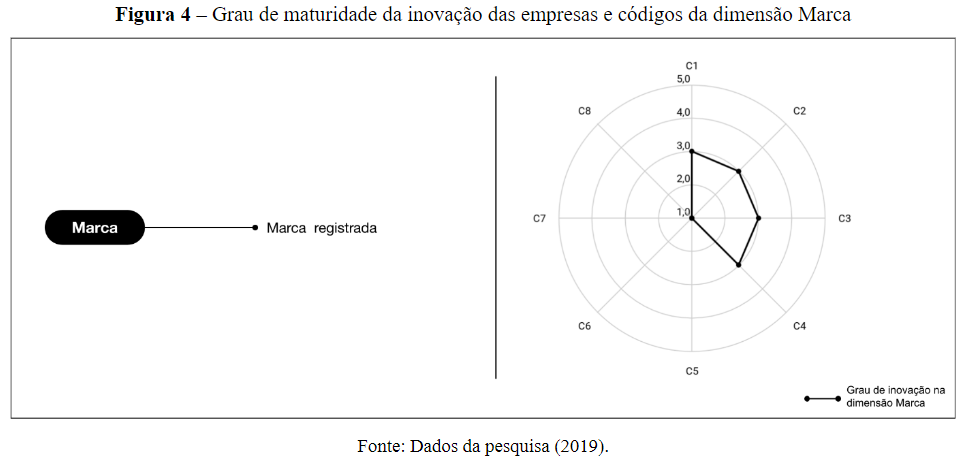 Analisadas quanto ao registro e utilização da marca, foi observado que apenas metade das empresas (que possuíam mais tempo de atuação) realizaram inovações nessa dimensão, através do registro na marca e identidade visual em órgãos reguladores. Segundo o SEBRAE (2016), o registro da marca possibilita proteger legalmente a empresa contra o plágio dos concorrentes que buscam ganhar espaço no mercado utilizando de uma marca já consolidada, assim é garantido aos proprietários o direito de uso exclusivo de sua marca em todo o território nacional. As empresas que não realizaram o registro não identificaram benefícios de tal ação. Além disso, a utilização da marca, em todas as empresas, é utilizada somente nos produtos. Na Figura 4 estão contidos os códigos e a pontuação das empresas na dimensão Marca.