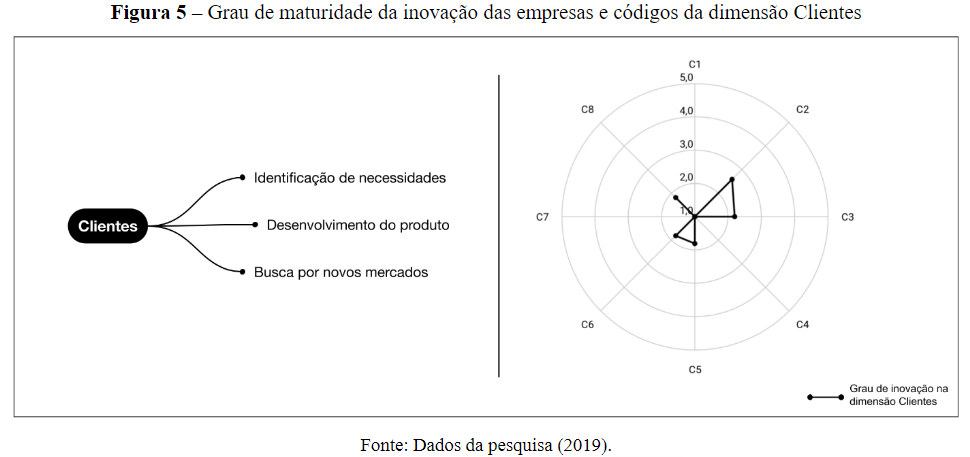 Convém destacar que essa atitude das empresas se deve ao fato destas atuarem atendendo a um portfólio fixo de clientes, sendo assim elevada a preocupação em oferecer produtos que atendamàs necessidades destes. Verifica-se que a existência desse portfólio fixo acaba sendo uma justificativa utilizada para não buscar novos mercados. Nos casos em que as empresas passaram a entregar seus produtos em outros estados brasileiros, isso ocorreu principalmente para continuar atendendo a clientes que atuam no Rio Grande do Norte e que migraram para outras localidades. Na Figura 5 estão contidos os códigos e a pontuação das empresas na dimensão Clientes.