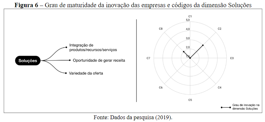 A incorporação de produtos, serviços e suporte ao produto principal da empresa tem com finalidade criar novas soluções aos clientes agregando valor à oferta, em um processo chamado de "servitization", fazendo com que a empresa se destaque competitivamente a partir da exploração de novas oportunidades do mercado (VANDERMERWE; RADA, 1988; ALMEIDA; MIGUEL; DA SILVA, 2011). Nesse sentido, as empresas foram analisadas quanto à oferta de produtos complementares e agregação de recursos/produtos/serviços. Apenas duas empresas realizam a combinação customizada de serviços capazes de solucionar as necessidades de seus clientes: uma orienta os clientes acerca da melhor utilização dos produtos para reduzir os custos durante o projeto inicial da obra; a outra realiza a contratação de caminhões de fretamento para clientes de outros estados. Para Brax (2005), empresas de manufatura que integram serviços em conjunto com seus produtos conseguem facilitar as suas vendas, aumentando a fidelidade dos clientes à empresa e construindo oportunidades de crescimento em mercados com pouca margem para diferenciação. Na Figura 6 estão contidos os códigos e a pontuação das empresas na dimensão Soluções.