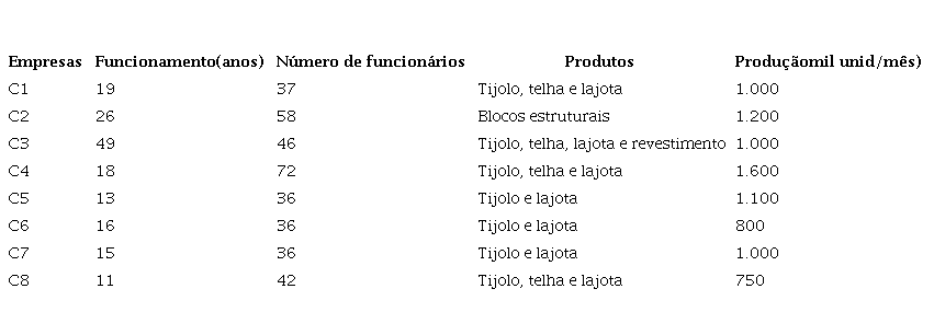 A amostra da pesquisa é composta por oito empresas do segmento da indústria da cerâmica vermelha do município de Itajá/RN. As cerâmicas analisadas atuamessencialmente na fabricação de quatro famílias de produtos: tijolo, telha, lajota e blocos estruturais e de revestimento. São empregados entre 72 (C4) e 36 (C5/6/7) funcionários em cada fábrica, que produzem em média aproximadamente 1,056 milhões de unidades por mês. Essa produção é destinada para o mercado interno, principalmente a região metropolitana de Natal, mas também para outros estados da região Nordeste, como o Ceará, Paraíba e Alagoas. Os dados relativos à caracterização da amostra estão contidos na Tabela 1.