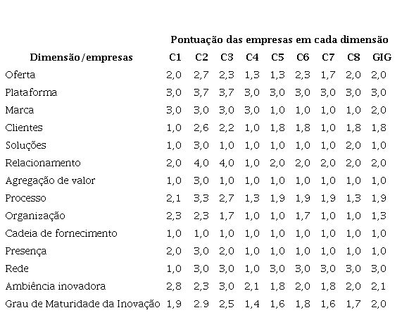Na Tabela 2 constam as pontuações obtidas pelas empresas quanto às respectivas dimensões do Radar da Inovação, sendo essas utilizadas para o cálculo do Grau de Maturidade da Inovação (GMI) de cada empresa e do Grau deMaturidade da Inovação Geral (GMIG). Apresentam-se destacadas as dimensões que obtiveram valores iguais ou maiores que três, evidenciando a existência mínima de inovação ocasional nas organizações analisadas.