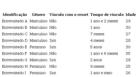 Se faz importante justificar a razão da inclusão de ex-funcionários da empresa nesta pesquisa. Durante a pré-pesquisa, notou-se a importância do período pós-desligamento desses sujeitos. Como esses trabalhadores viveram dentro dos resorts, com hábitos e costumes diferentes, se comparados com a realidade fora da organização, foi percebido um duro impacto em suas rotinas, já que o sujeito acaba por se chocar com uma realidade bem diferente da que ele vivia no período em que atuava na rede. Além disso, não foram encontrados obstáculos metodológicos que configurassem prejuízo aos resultados quando a pesquisa inclui trabalhadores já desligados da organização.