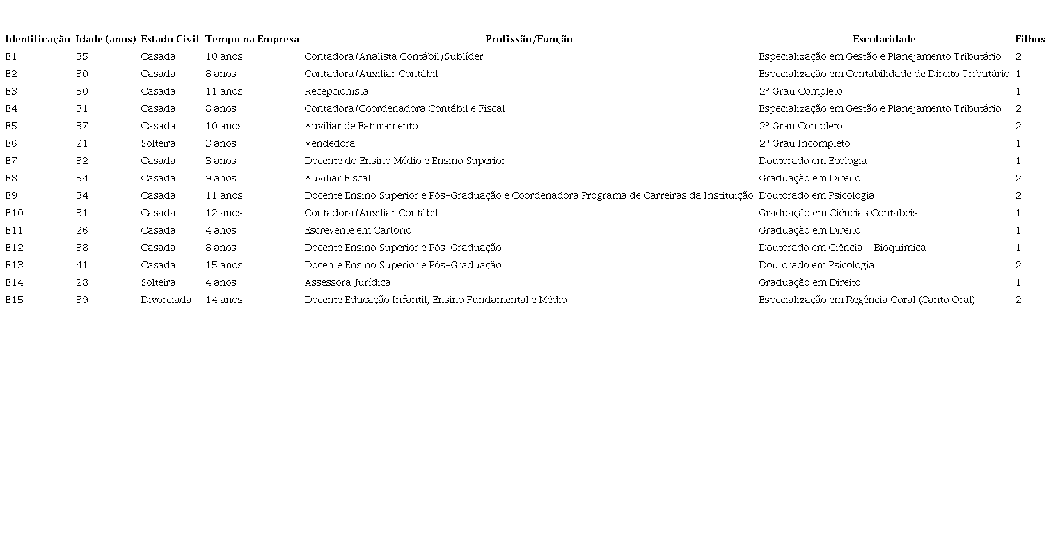 As entrevistadas têm de 21 a 41 anos; são casadas, solteiras ou divorciadas; têm um ou dois filhos; possuem de ensino médio incompleto a pós-graduação completa; trabalham de três a quinze anos na atual empresa (Quadro 1).