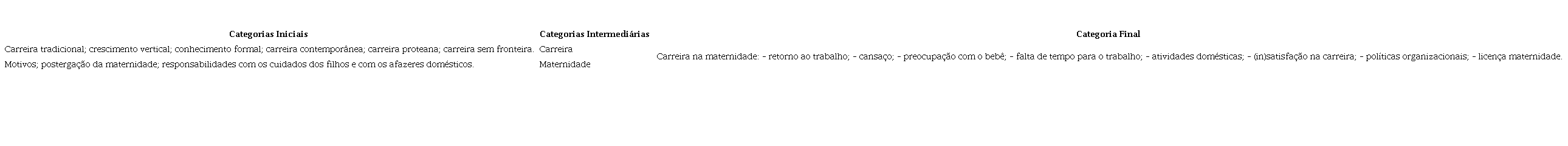 Essa seção contém a análise dos resultados, combase nas categorias intermediárias: ‘carreira’ que aborda o entendimento das entrevistadas sobre carreira; e ‘maternidade’ que examina a percepção delas sobre a maternidade. Por fim, essas análises resultaram na categoria final ‘carreira e maternidade’ que trata dos desafios para a conciliação de ambas as atividades.