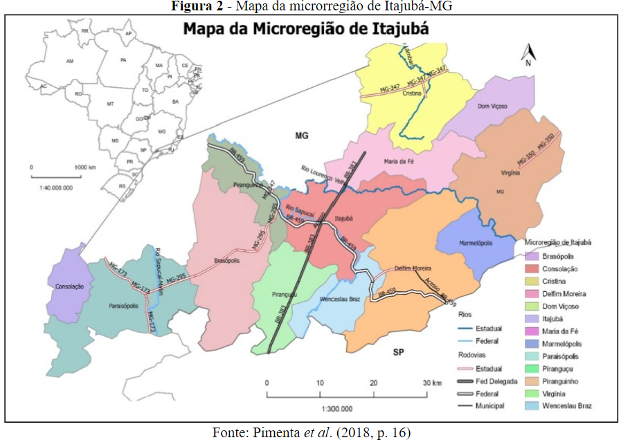 A Microrregião de Itajubá (MRI) está situada na mesorregião do sul-sudoeste de Minas Gerais (Figura 2), e é composta por 13 municípios: Brazópolis, Consolação, Cristina, Delfim Moreira, Dom Viçoso, Itajubá, Maria da Fé, Marmelópolis, Paraisópolis, Piranguinho, Piranguçu, Virgínia e Wenceslau Brás, tendo como sede o município de Itajubá. Este é o município mais antigo, fundado em 1819 e historicamente influenciado pela colonização e cristianismo, de origem portuguesa, visualizada em monumentos coloniais, igrejas e festas devocionais(IBGE. Cidades, 2018).