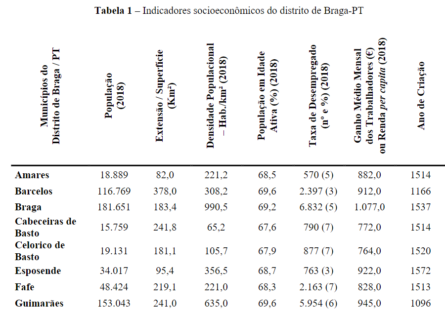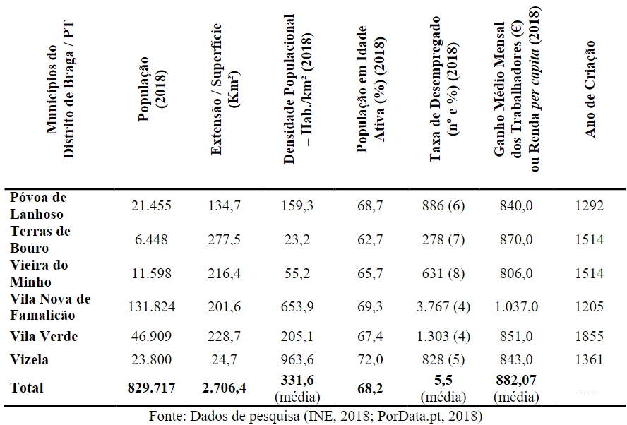 Quanto àseleçãodosdadossecundários, alguns esclarecimentos são necessários. O levantamento censitárioacontece de 10 em 10 anos nos dois países, sendo que os próximos levantamentos estavam previstos para 2021, em ambos.Nesse sentido, as informações relevantespara esta pesquisa - população, densidade populacional, taxa de desemprego e ganho médio mensal per capita dos trabalhadores - se encontram disponíveis na modalidade estimativas e datam de 2017 (Brasil) e 2018 (Portugal). Além disso, os dados econômicos da MRI foram convertidos para euro, moeda da União Europeia, referentes aos valores de compra no mercado de câmbio (R$ 3.9672 por 1.00 €) do antepenúltimo dia do ano (29.12.2017), escolha feita dada à estabilidade da moeda europeia. As informações foram elaboradas como dispositivo panorâmico que retrata a realidade e aponta a importância da cultura, do turismo e do local na alavancagem do desenvolvimento regional e sinaliza as evidências sobre os aspectos do desenvolvimento que os agentes deverão considerar.