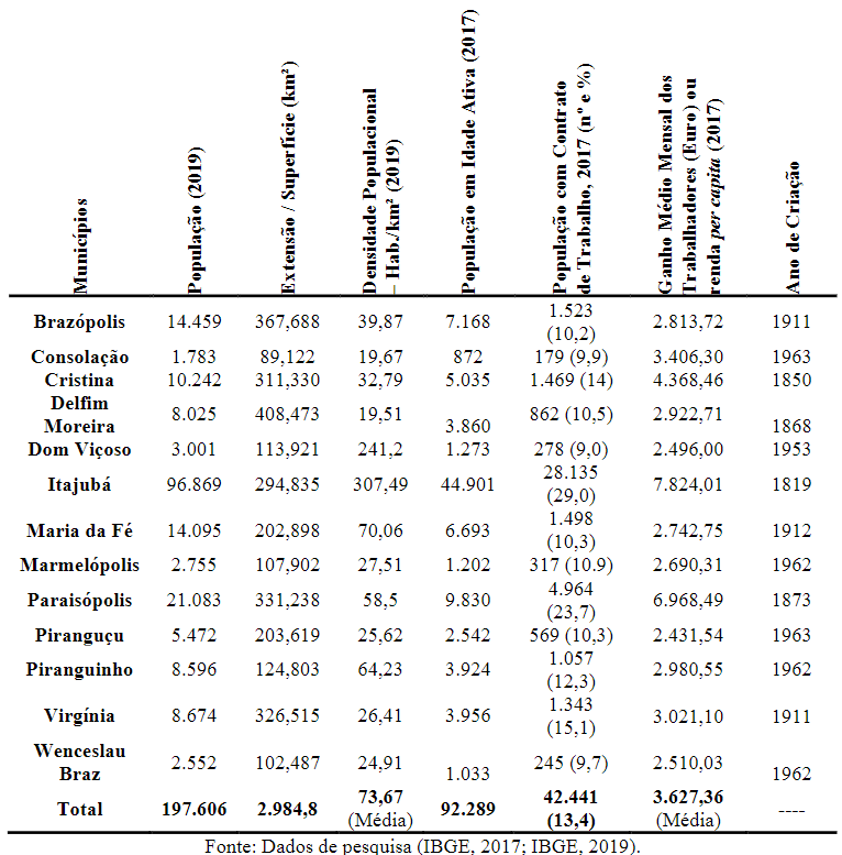 A Tabela 2 apresenta os indicadores socioeconômicos da MRI. A população foi estimada em 197.606 habitantes, sendo o município de Itajubá (sede) o mais populoso (96.869) e Wenceslau Braz o que possuí menos habitantes (2.552). A extensão territorial atinge uma área de 2.984,831 Km², tendo o município de Delfim Moreira 408,473 km² e Consolação 89,122 km². A média da densidade populacional dos municípios da microrregião era de 73,67 hab./km², em 2019, sobressaindo Itajubá (307,49 hab./km²). Na conversão da moeda brasileira para a da União Europeia observa-se melhor comparação entre os dois territórios.