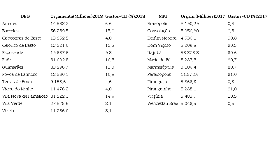 Itajubá (58.373,86 €) e Braga (94.171,8 €)registram os maiores orçamentose estabelecem distintas relevâncias à cultura, em termos de alocação de recursos, pois todos os municípios da MRI orçam índices abaixo de 1%, à exceção do município de Paraisópolis, em que o orçamento chega a 1%. No DBG, o orçamento é mais elevado, embora este esteja conjugado com o desporto. Mesmo assim, não deixa de ser indicativo de maior preocupação com a cultura, visto que os dados ilustram a realidade e confirmam que o poder público (e agentes privados) têm um papel de relevância na alavancagem de alternativas de desenvolvimento local, nomeadamente no âmbito de atividades criativas (turismo, economia criativa e cultura). Denunciam, também, que os municípios conservam nos seus domínios territoriais elementos de cultura, material e imaterial, e recursos, naturais e arquitetônicos, que são de elevado valor.
